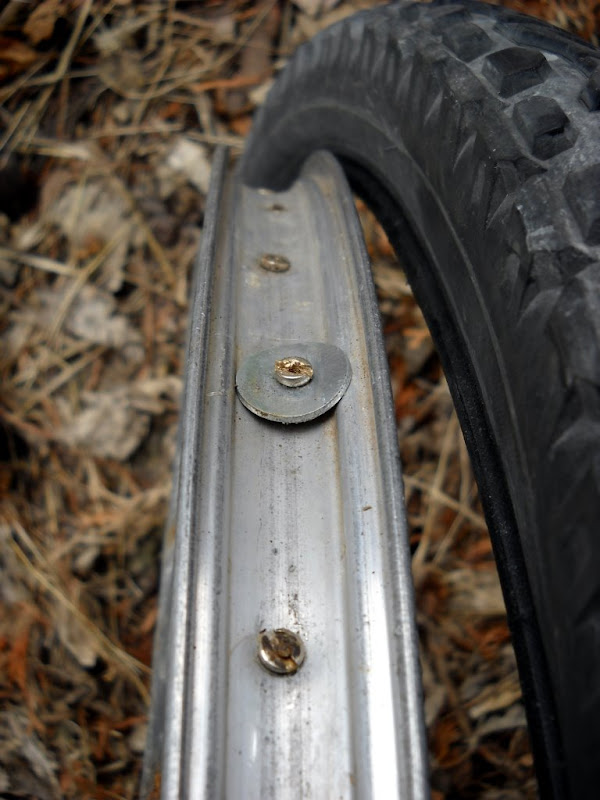 If I had the time I'd rebuild the rear wheel with a sturdier rim. The rim I chose had a couple of herniated spoke holes, which allowed the spoke nipples to pass right through them. I had to place washers over the holes to narrow them enough to grab the spoke nipples: