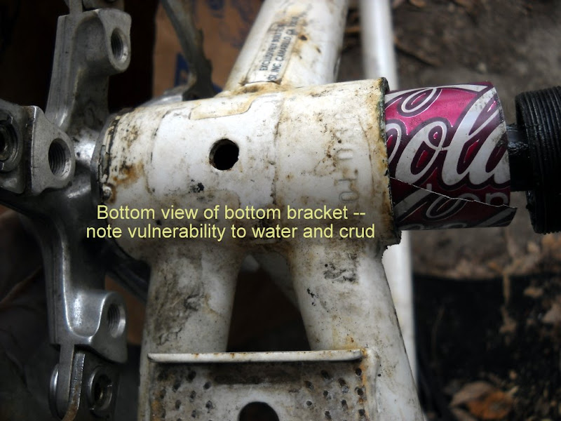 I'd hoped to replace the old-fashioned bottom bracket with a decent sealed cartridge bottom bracket from another carcass but the cartridge was a little too wide. So I had to overhaul the existing bottom bracket by transplanting bearings and retainers from other old bottom brackets. This worked fine. But then I remembered an old trick. If you cut up an old aluminum can and wrap it between the spindle and the shell it protects the mechanism from much of the water and mud that inevitably works its way into the frame. This simulates a bit of the protection provided by a modern sealed cartridge. So I disassembled the bottom bracket again and inserted a can of Cherry Cola.