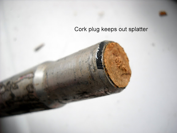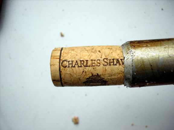 Since this is an old-style open-ended seat post I then decided to plug both ends so that gunk would not run down the seat tube to the bottom bracket. I used wine bottle corks, one from a bottle of Two Buck Chuck: