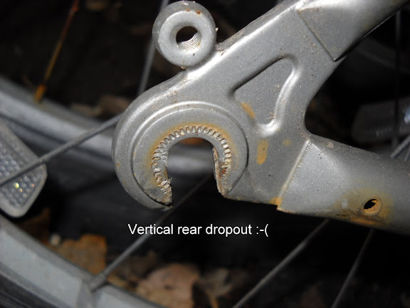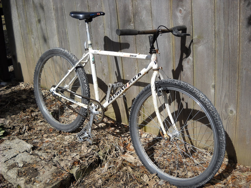 Used frames with horizontal dropouts seem to be harder and harder to come by because (a) they've gone out of style, and (b) many of the old ones have already been converted to fixies. Although I originally planned to build a 27" or 700c road fixie the best frame in my pile with horizontal dropouts was a 26" mountain bike. So that's the one I picked. It has worked out well for utility riding around town, handy over railroad tracks or on muddy dirt paths and in the snow.